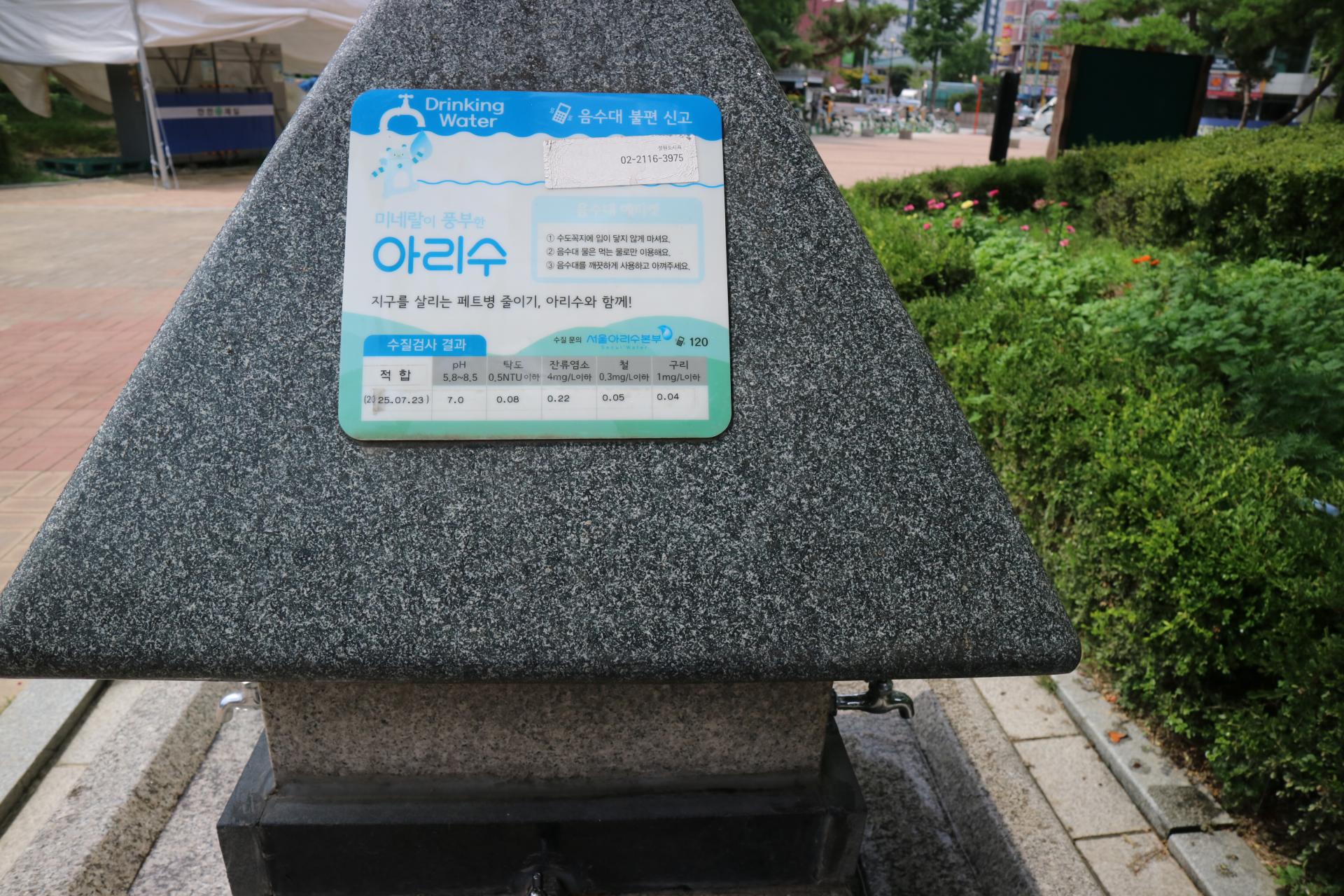 그렇다면 생수 냉장고 사업이 운영되는 공간에는 물을 마실 수 있는 시설이 아예 없을까? 생수 냉장고 사업이 운영되는 공원과 산책로에는 대부분 이미 공공 음수대가 설치되어 있었다. 햇볕에 달궈져 미지근한 물이 나오다가도 잠시 물을 흐르게 두면 금세 시원한 물이 흘러나왔다. 공공 음수대 바로 옆에서 생수 냉장고 사업을 진행하고 있는 경우도 많았다. 음수대 안내판에 쓰여진 ‘아리수와 함께’, ‘페트병 줄이기’를 실천하자는 문구가 무색해질 지경이었다.
