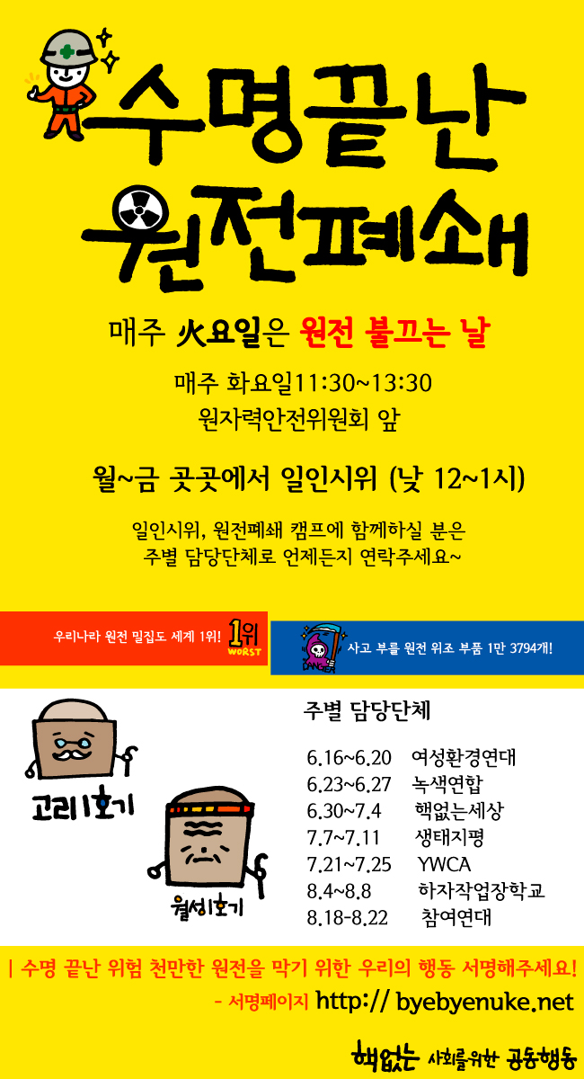 막자! 원전사고!!위험천만한 원전을 막기 위해 매주 화요일 낮, 광화문 원자력안전위원회 앞에서 '수명끝난 원전 끝 캠프'를 진행합니다.또한 곳곳에서 일인시위도 합니다.함께해주실거죠? :) 마음은 있지만 현장에 오실 수 없는 분들은 꼬옥 서명 부탁드립니다!http://byebyenuke.net > 서명페이지