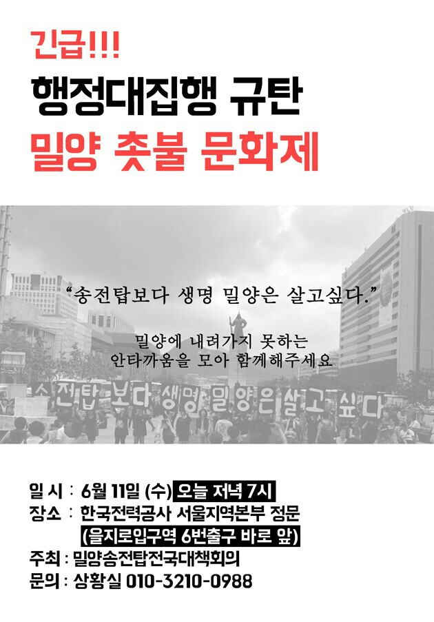 긴급!!!행정대집행 규탄밀양 촛불 문화제 “송전탑보다 생명, 밀양은 살고싶다.”밀양에 내려가지 못하는안타까움을 모아 함께해주세요 일 시 : 6월 11일 (수) 오늘 저녁 7시장소 : 한국전력공사 서울지역본부 정문(을지로입구역 6번출구 바로 앞)주최 : 밀양송전탑전국대책회의문의 : 상황실 010-3210-098