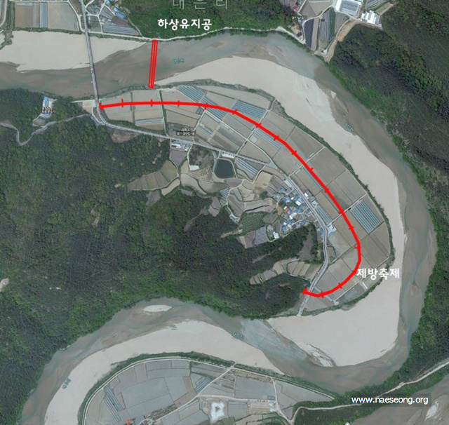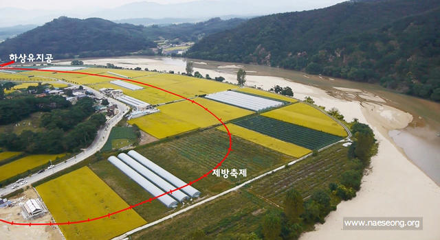낙동강의 생명을 크게 훼손한 4대강공사도 모자라, 하천공사가 낙동강 지천까지 확산되고 있습니다. 360도 물굽이로 유명한 국가명승지16호 회룡포 백사장과 내성천 하류에 남아있는 자연 제방이 ‘내성천 하천환경 정비사업’이라는 이름으로 사라져 갈 위기에 처해있습니다.'내성천 환경정비 사업 철회'를 위한 서명 운동에 참여해 주세요![button text='서명하기' link='http://bbs3.agora.media.daum.net/gaia/do/petition/read?bbsId=P001&articleId=150207#commentFrame' size='large' style='default' target='_blank'] 회룡포는 1박2일의 촬영지가 되어 갑자기 유명해진 곳이기도 합니다. 하지만 그 이후에 상류에는 영주댐공사, 하류에는 4대강 공사에 대한 영향으로 우리나라에 하나뿐인 모래강 내성천은 계속 거칠어지고있습니다. 내성천은 낙동강에 1급수를 공급하며, 삵,수달, 솔부엉이, 솔개, 흰수마자 등 멸종위기종의 서식처이자 모래가 풍부하고, 선조들이 만든 자연제방이 잘 보존되어있는 1급수의 강입니다. 내성천은 이러한 이유때문에 '우리나라 하천 유전자'의 이라 불리우는 소중한 강입니다. 이러한 인식을 바탕을 수많은 영화와 다큐멘터리가제작되기도 했습니다. 그런데 부산국토관리청은 ‘내성천하천정비사업’의 공사 입찰을 진행한다고 합니다. 이 사업은 두 개의 보(유사조절지)와 2.280m의 제방, 2.652m의 보축 공사, 3개의 교량이 계획된 사업입니다. 특히 356억이 소요되는 용궁지구 하천환경정비 공사는 내성천의 자연환경을 훼손하며, 지역주민들은 조상 대대로 농사지어온 옥토를 잃게 됩니다. 문제점1)이 사업의 목적이 불분명합니다. 홍수가 나지 않는 곳에 홍수예방? 건설교통부는 이 사업이 ‘홍수대비’라고 이야기 하지만 이곳에서 조상대대로 터 잡고 살던 지역주민들은 이곳에는 ‘홍수가 없는지역’이라고 합니다. 홍수가 없는 곳에 홍수대비를 하겠다니, 4대강공사를 밀어부치던 논리와같습니다. 만약 홍수 지역이었다면 지역에서 먼저 제안했을거라 말씀하십니다. 회룡포는 자연제방이 잘 되어있고 비가 많이 와도 논 습지에서 물을 받아주어 큰 피해가 난 적이 없습니다. 공사가 강행되면 사진의 붉은 선 밖의 논, 자연 제방, 모래톱은 모두 사라지게 됩니다.