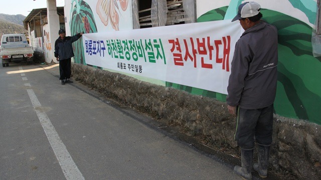 “만약에 홍수 대책으로 우리 동네에 이만치 제방을 쌓는다면 무의미한기라. 가만 내두어도 (물이) 안 드는데 왜 제방을 쌓느냐 이 말이지, (물이)들어 봐야 가에 한 필지 정도 드는데, 이 구간도 다 들어가는 게 아니고 이 높은 구간은 물 갈 생각도 않는데,““앉아서 지도위에 낙서를 했느냐 ? 이 그림이 뭐냐? 볼펜 가는 대로 그린 거 아니냐?” “옛날에 홍수 피해 많이 보고 그랬으면 제방 해달라고 벌써 건의를 했을 거다. 홍수 때문에 도저히 못사니까. 다른 동네 다하고 여기만 빠져먹었거든, 우리 동네 여기만, 당장 급할 것 같으면 벌써 했을 건데 필요 없으니까 안한 거 아닌가? 물도 안 들어가는데 제방은 폼으로 하냐는 거지 내말은.” “이거 피해본다고 하면 땅 다 들어가면 피해보나마나, 가만 나둬도 피해 볼 것도 없고, 제방은 갈구치기만 갈구치지, 제방 안에 땅만 못쓰게 만드는 거지. 살아보지도 않고 어떻게 그렇게 잘 압니까? 제방을 해야 된다 안해야 된다.”