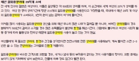 그러나 역시! 대안생리대는 참 기특한 녀석이구나 하는 결론이 딱! 대안생리대를 고민하는 분들에겐 일단 사용해보라고 권하고 싶은 마음이 팍팍, 컨퍼런스 자료 준비를 하며, 겸사겸사해서 저는 좀 더 일회용품의 안 좋은 점에 대해 공부해봐야겠습니다!------------------------------------------------------글쓴이: 여성환경연대 서포터즈 컨텐츠 팀 모모