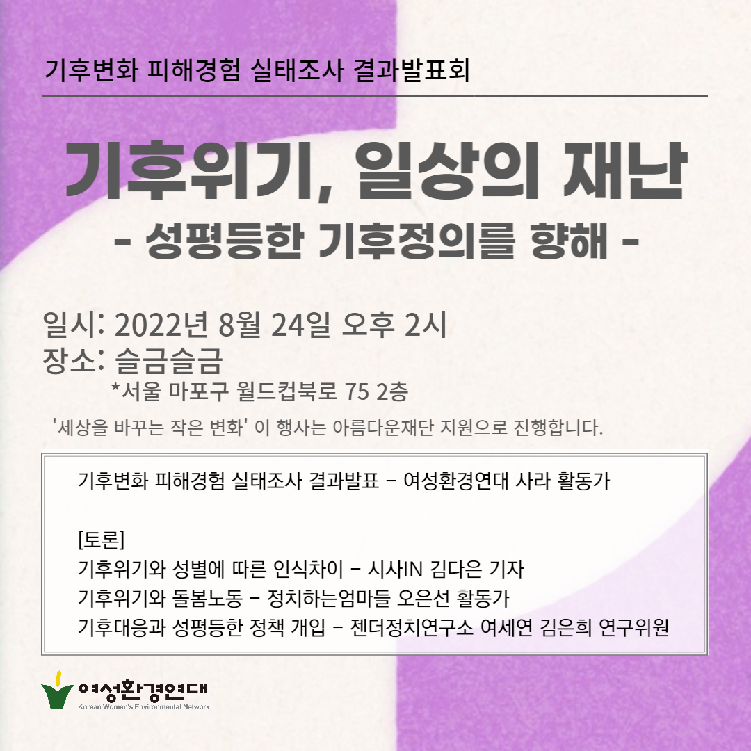 여성환경연대에서 올해 상반기에 진행한 기후변화 피해경험 실태조사 결과 발표회를 진행합니다. 기후위기에 대한 인식부터 돌봄, 정책까지 기후위기를 젠더관점으로 살펴보는 시간을 가져보려 합니다.👀 성평등한 기후위기 대응을 고민하고 계신 분이라면 다들 모여서 함께 편하게 대화나눠보아요!