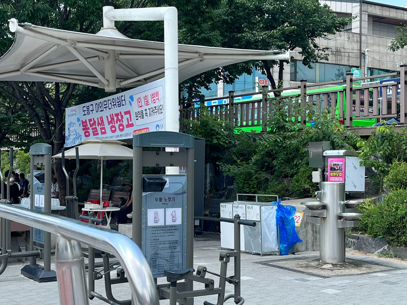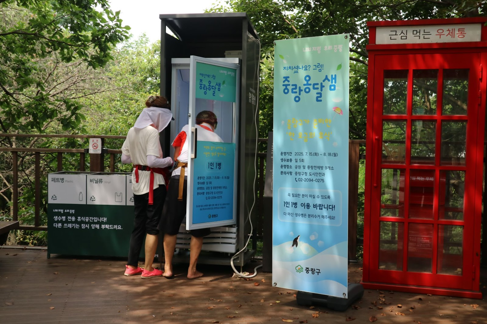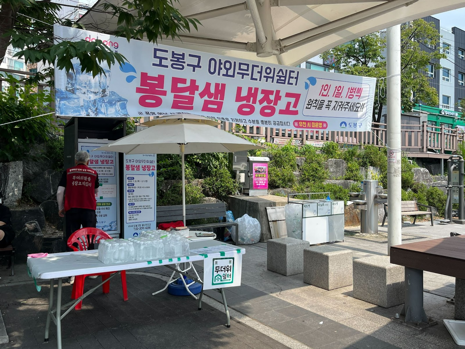 우이천 수유교 다리 아래, 아주 가까운 장소에서 강북구와 도봉구의 생수 냉장고가 동시에 운영되고 있었습니다.