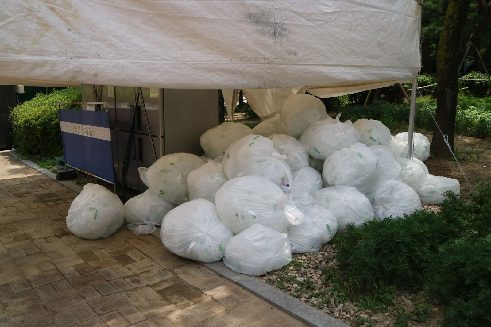 부스의 바로 옆으로 사용된 폐페트병 쓰레기가 대량으로 쌓여있습니다.