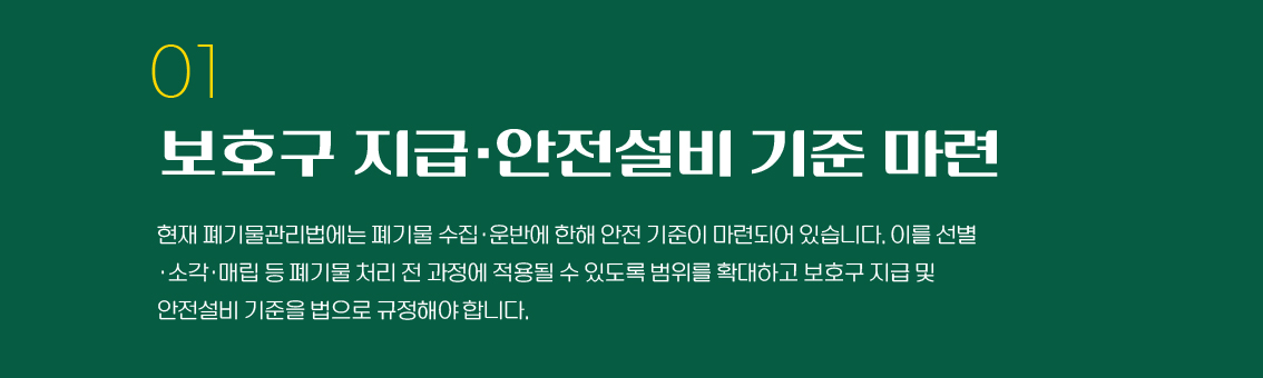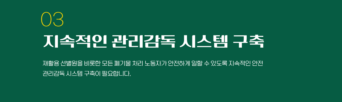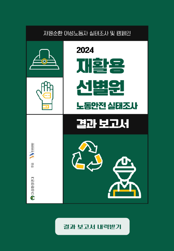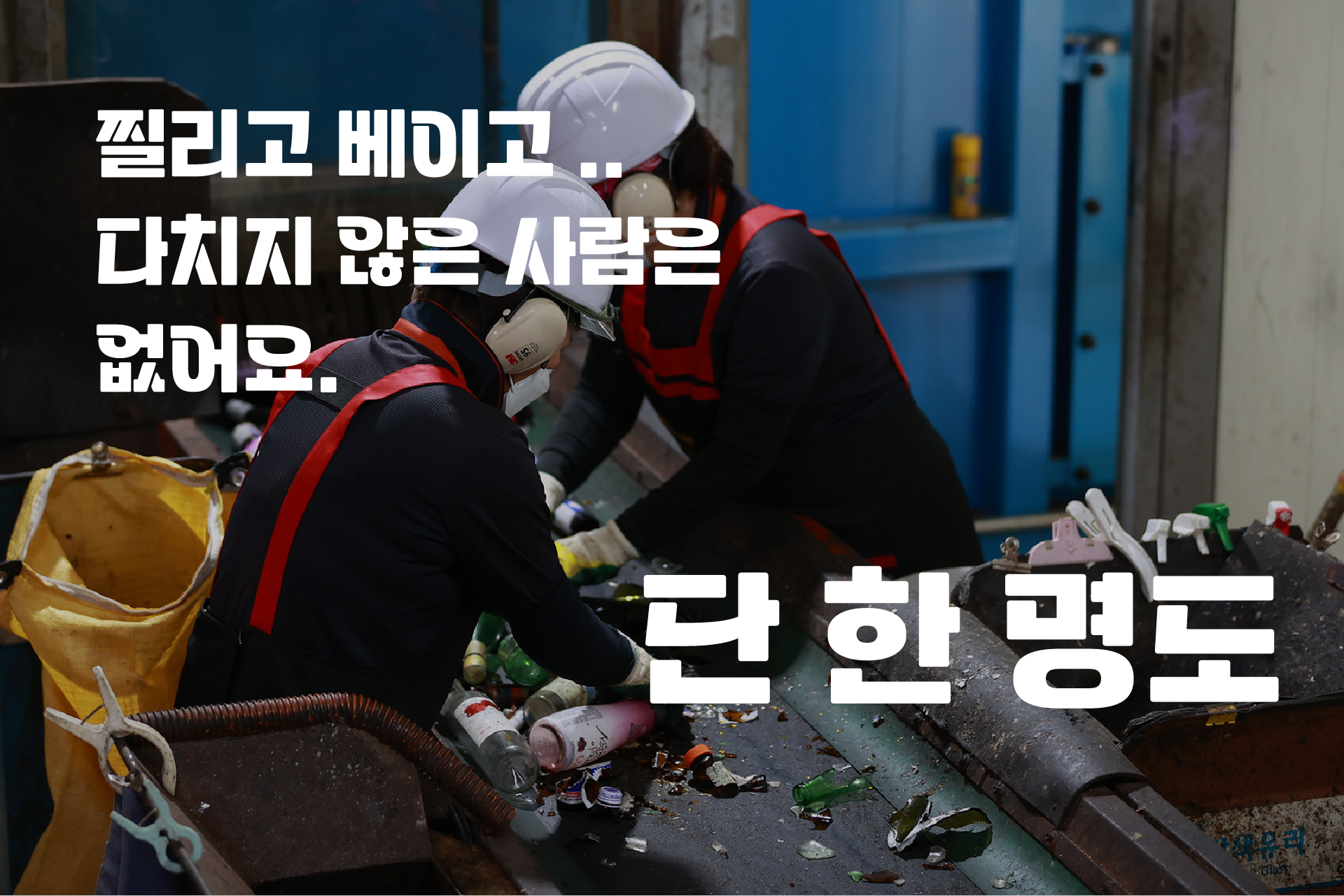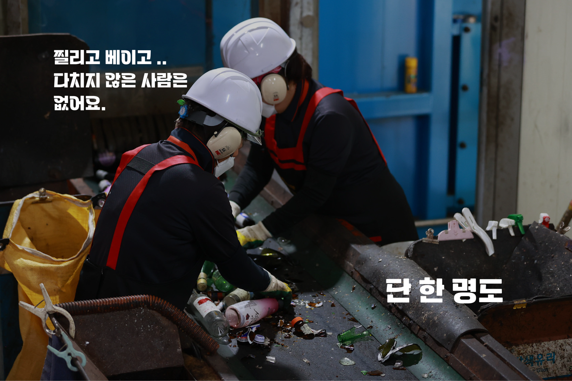 재활용 선별원은 컨베이어 벨트 위 수북한 폐기물 더미에서 재활용 가능한 품목을 순식간에 집어내는 고도의 숙련노동자입니다. 또한, 함부로 버려진 가연성 물질, 화학물질, 의료 오염물에 수시로 노출되는 노동자이기도 합니다. 조사에 응답한 모든 선별원은 유리 조각, 어묵 꼬치, 주사 바늘에 찔리거나 베이는 산업재해를 겪었습니다. 선별원에게는 사고를 방지해 줄 산업용 보호 장갑을 비롯한 제대로 된 보호구가 필요하지만, 이는 턱없이 부족합니다.